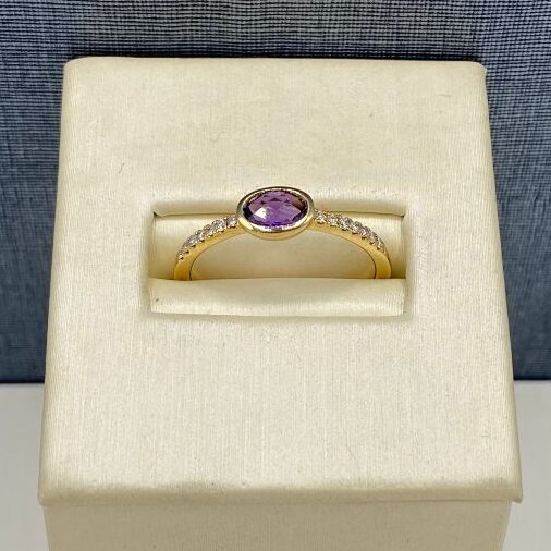 Home » Browse Jewelry » Bezel Set Amethyst Center with Diamonds in Yellow Gold