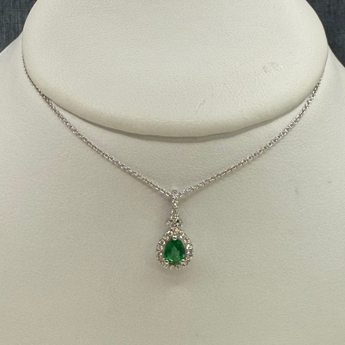 14kw, Pear Cut Emerald =0.27ctw, Dia Halo and Bail=0.13ctw, 16-18″ Cable Chain, H06583