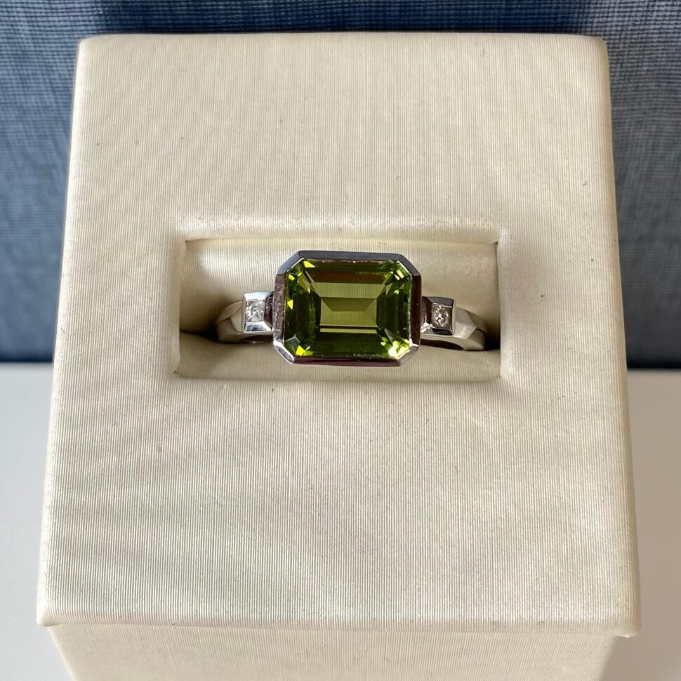Home » Browse Jewelry » Peridot and Diamond Ring with White Knife Edge Shank