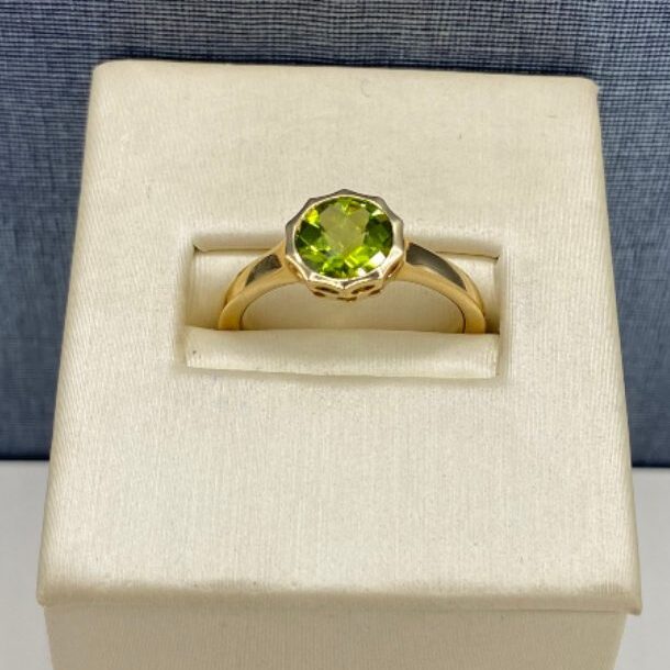 Home » Browse Jewelry » Rose Cut Peridot in Yellow Decagon Bezel